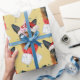 Navidades de pastores alemanes del Colorful Dog Holiday envuelto en papel con una hermosa acuarela de un pastor alemán con un Gorra de Santa rojo y una bufanda de Navidades rojos, y un fondo amarillo con coloridas estrellas acuáticas.