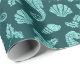 Este papel de envoltura de Navidades costeros presenta un patrón de caballitos de mar purpurina azul acuático, conchas marinas y estribos holly sobre un oscuro fondo verde azulado, para un diseño festivo de vacaciones en la playa.