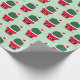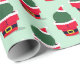 Navidades de novedad envolviendo papel con un patrón de cactus en trajes de Santa sobre un fondo verde.