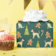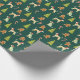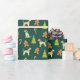un papel de envoltura con temática de Navidad con un patrón de repetición. El patrón consta de varios elementos, incluyendo lápices de colores con sombreros de Santa Claus rojos y pañuelos rojos, árboles verdes de Navidad decorados con ornamentos rojos, hombres de jengibre y latas de dulces. El color de fondo del papel envolvente es verde oscuro, que contrasta con los elementos coloridos. El diseño es festivo y caprichoso, por lo que es adecuado para envolver regalos de Navidades, especialmente para los amantes de los perros o para los amantes de las vacaciones lúdicas.
