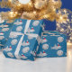 Navidades envolviendo papel con tiburones adorables, sonrientes, con sombreros de Santa que llevan bolas de discoteca en un patrón repetido en un fondo azul. Navidades de Disco Ball Shark Santa Ha envuelto papel de diseño de vacaciones | ©Melissa Patton - Artista/Ilustrador