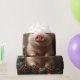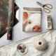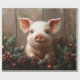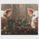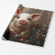 Papel de envolvimiento de la página con una pintura al óleo digital de un lindo cerdo rodeado de conos de pino y guirnaldas de pino con luces de Navidad. El fondo de madera aporta un toque rústico a las obras de arte.
