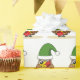 Ilustracion de un tímido búho de elfo feliz con sombrero de santa verde y regalo rojo con cinta amarilla. Este lindo diseño personalizado es un regalo para los amantes de las lechuzas, los amantes de las aves y los amantes de la fantasía o de las películas mágicas. ¿Estás emocionado de recibir tu regalo a los Navidades?