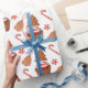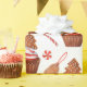 Nuestro Navidad escrupuloso Gingerbread Cookie Cupakes Wrapping Paper presenta ilustraciones acuarelas de quequitos de chocolate con escarcha de rayas rojas y blancas coronadas con un árbol de navidad de galletas de galletas de Gingerbread y dulces de menta de color rojo y blanco sobre un fondo blanco puro.