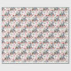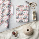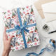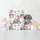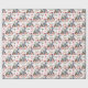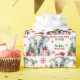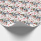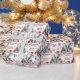 El patrón repetido en este papel de Navidades es de un tierno elefante gris que lleva un sombrero de Santa Cruz de color rojo y blanco. El elefante se alza en medio de pinos y de regalos navideños bien envueltos. El texto rojo y verde dice "MERRY CHRISTMAS", con el nombre de su hijo y su firma debajo. Otras imágenes incluidas en el patrón incluyen copos de nieve decorativos rojos y latas de dulces.