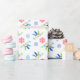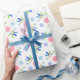 Navidades coloridos envolviendo papel con fondo blanco y patrón festivo de copos de nieve y luces Navidades, con texto gráfico que lee Merry y Bright, hecho en verde claro, azul y rojo.