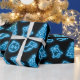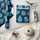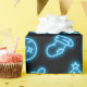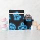 Un patrón ininterrumpido de elementos de Navidades azul neón, incluidos árboles de Navidad, campanas, medias y ornamentos sobre un fondo negro