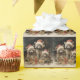 Adorable papel de envolver de Navidad vintage con adorables Raccones sentados junto a algunos regalos envueltos y usando una gorra como la de Santa.