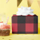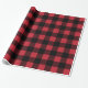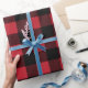 Este Navidad presenta un diseño de papel de envoltura vacacional con una rústica y moderna casa de campo de ladrillo rojo y negro con estampado de búfalo a gran escala.