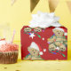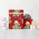 Oso de peluche marrón enredado en Navidades con luces de fondo rojo con estrellas blancas.