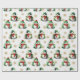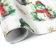 Hombre de nieve con gorra verde y pañuelo rojo con patrón de copos de nieve dorados sobre fondo blanco de nieve, mejor para la temporada de vacaciones envolver regalos