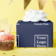 Es fácil crear papel de envoltura de marca para los regalos corporativos de tu empresa. Simplemente reemplace la imagen de pantalla con el logotipo de su empresa. Bajo la imagen, hay una línea de texto en blanco para el nombre de su empresa o un mensaje personalizado. El papel de envoltura es azul oscuro de medianoche (hex #08113B).