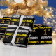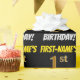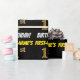 Este diseño de papel envolvente incluye un mensaje como "¡PRIMER CUMPLEAÑOS!", con el "primero" con un aspecto de color falso/imitación dorado, y con el nombre y el "CUMPLEAÑOS" en un tipo de letra divertido y audaz. El nombre es personalizable, y el fondo es negro de color. El envolvimiento de papel como este podría ser usado cuando se le dan regalos de cumpleaños a alguien en celebración de su primer cumpleaños. [~Z0000203]