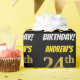 Este diseño de papel envolvente incluye un mensaje como "¡EL CUMPLEAÑOS 24 DE ANDREW!", con el "24º" con un aspecto de color falso/imitación de color dorado, y con el nombre y el "CUMPLEAÑOS" en un tipo de letra divertido y audaz. El nombre se puede personalizar y el fondo es negro de color. El envolvimiento de papel como este podría ser usado cuando se le dan regalos de cumpleaños a alguien en celebración de su 24 cumpleaños. [~Z0000203]