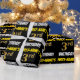 Este diseño de papel envolvente incluye un mensaje como "¡Tercer cumpleaños!", con el "Tercer" con un aspecto de color falso/imitación de oro, y con el nombre y el "CUMPLEAÑOS" en un tipo de letra divertido y audaz. El nombre se puede personalizar y el fondo es de color negro. El envolvimiento de papel como este podría ser usado cuando se le dan regalos de cumpleaños a alguien en celebración de su tercer cumpleaños. [~Z0000203]