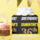 Este diseño de papel envolvente incluye un mensaje como "¡EL CUMPLEAÑOS 36 DE SAMANTHA!", en el que el "36" tiene un aspecto de color falso/imitación dorado, y con el nombre y el "CUMPLEAÑOS" en un tipo de letra divertido y audaz. El nombre se puede personalizar y el fondo es negro de color. El envolvimiento de papel como este podría ser usado cuando se le dan regalos de cumpleaños a alguien en celebración de su 36º cumpleaños. [~Z0000203]
