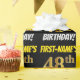 Este diseño de papel envolvente incluye un mensaje como "¡CUMPLEAÑOS 48 DE PRIMER NOMBRE!", en el que el "48" tiene un aspecto de color falso/imitación de color dorado, y con el nombre y el "CUMPLEAÑOS" en un tipo de letra divertido y audaz. El nombre es personalizable, y el fondo es negro de color. El envolvimiento de papel como este podría ser usado cuando se le dan regalos de cumpleaños a alguien en celebración de sus cuarenta y ocho años. [~Z0000203]