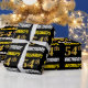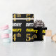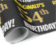 Este diseño de papel envolvente incluye un mensaje como "¡54º CUMPLEAÑOS DE REGINALD!", en el que el "54º" tiene un aspecto de color falso/imitación dorado, y con el nombre y el "CUMPLEAÑOS" en un tipo de letra divertido y audaz. El nombre es personalizable, y el fondo es negro de color. El papel envuelto como este podría ser usado cuando se le dan regalos de cumpleaños a alguien en celebración de sus cincuenta y cuatro años. [~Z0000203]