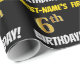 Este diseño de papel envolvente incluye un mensaje como "¡SÉPTIMO CUMPLEAÑOS DE NOMBRE PRIMERO!", en el que el "sexto" tiene un aspecto de color falso/imitación de color dorado, y con el nombre y el "CUMPLEAÑOS" en un tipo de letra divertido y audaz. El nombre se puede personalizar y el fondo es de color negro. El envolvimiento de papel como este podría ser usado cuando se le dan regalos de cumpleaños a alguien en celebración de su sexto cumpleaños. [~Z0000203]