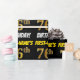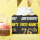Este diseño de papel envolvente incluye un mensaje como "¡CUMPLEAÑOS 76 DE PRIMER NOMBRE!", mientras que el "76" tiene un aspecto de color falso/imitación de color dorado, y con el nombre y "CUMPLEAÑOS" en un tipo de letra divertido y audaz. El nombre se puede personalizar y el fondo es negro de color. El envolvimiento de papel como este podría ser usado cuando se le dan regalos de cumpleaños a alguien en celebración de sus setenta y seis años. [~Z0000203]
