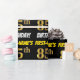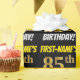 Este diseño de papel envolvente incluye un mensaje como "¡CUMPLEAÑOS 85 DE PRIMER NOMBRE!", en el que el "85" tiene un aspecto de color falso/imitación de color dorado, y con el nombre y el "CUMPLEAÑOS" en un tipo de letra divertido y audaz. El nombre es personalizable, y el fondo es negro de color. El envolvimiento de papel como este podría ser usado cuando se le dan regalos de cumpleaños a alguien en celebración de sus ochenta y cinco años. [~Z0000203]