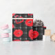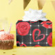 Presenta un fondo negro, con rosas rojas vibrantes, corazones rojos y huellas de labios rojos.