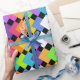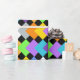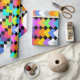 Este papel de envoltura tiene un diseño geométrico de diamantes de neón que se superponen en un campo de negro.