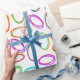 Este papel de envoltura tiene un diseño geométrico de grupos de tres óvalos en colores de neón esparcidos por un campo de blanco.