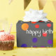 La polka de neón brillante sobre fondo gris con texto de feliz cumpleaños. Se puede cambiar el color de fondo.
