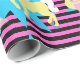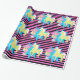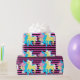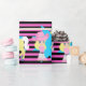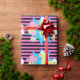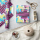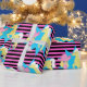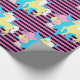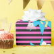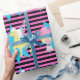 Niñita de vaca rubia con una huella de caballo en papel de envolver regalo de rayas rosadas y negras.