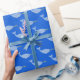Este impresionante papel de envoltura presenta una imagen de arte digital de un lindo y mágico bebé Narwhal azul. El cuerpo principal del Narwhal tiene una textura áspera y es azul, mientras que el vientre es de color azul gris. El Narwhal tiene un ojo morado con un alumno blanco y un cuerno dorado brillante en la cara. También tiene una cola delicada y aletas.