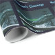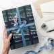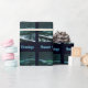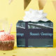Una escena nocturna en el extremo norte. La noche ha caído y hay un indicio de las luces del norte más allá de las montañas en el horizonte. La luz de la luna refleja el paisaje cubierto de nieve. Un búho se sienta en un abeto muerto buscando voles. El texto que dice "Saludos de temporada" aparece en azul y blanco resplandeciente.