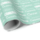 Papel de envolvimiento de color con nombre verde de la menta marina de moda para una fiesta de cumpleaños o una ducha de bebé decorada con nueve tipos de letra diferentes que escriben un nombre personalizado en blanco. Envoltura personalizada de regalo para niños con tipografía divertida.