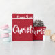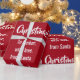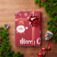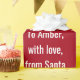 Pequeños, graciosos y también elegantes Navidades dan un chirrido a los niños con las palabras "Feliz Navidad" en una tipografía elegante, una dedicación personalizada que ahora lee "A Amber / con amor / de Santa", copos de nieve, Santa con su traje rojo (sosteniendo un bastón de caramelo) y su reno favorito, Rudolph, detrás de él, y un árbol de Navidad. Sobre un fondo rojo con copos de nieve.