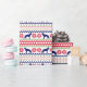 The repeated pattern on this colorful Christmas Nordic sweater style gift wrapping paper is a silhouette German Shepherd Dog among snowflakes, trees, and geometric designs. Colors include navy blue, bright Holiday green, and red, all on a white background.