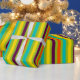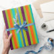 Este papel de embalaje brillante ofrece rayas intrépidas en sombras de verde, de púrpura, de anaranjado, de azul y de amarillo de nuestra nueva paleta de colores retra.