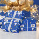 Creative nurse graduation gift wrap featuring royal blue hospital scrubs and stethoscope illustration. To personalize edit text to add name of nurse.