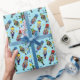 A cute and colorful pattern of nutcrackers, mistletoes, and bells with a baby blue background.