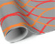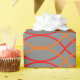 Este papel de envoltura tiene un diseño boho de ondas naranjas y rojas en un campo de gris.