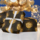 Elegantes Navidades modernos envueltos papel con brillantes bolas doradas purpurinas adornadas en Navidad sobre fondo marrón oscuro.