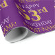 Este diseño de papel envolvente presenta un mensaje como "FELIZ 53º CUMPLEAÑOS", en el que el "53º" tiene una apariencia de imitación de oro. También tiene un nombre que se puede personalizar y un fondo de color morado. Tal vez podría usarse cuando se envuelven regalos para el cincuenta y tercer cumpleaños de alguien. [~Z0000134]