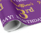 Este diseño de papel envolvente incluye un mensaje como "¡El tercer cumpleaños de FirstName!", y el "tercero" tiene una apariencia de color falsa/imitación dorada. El nombre se puede personalizar y el fondo es morado. Tal vez podría usarse cuando se envuelven regalos para el tercer cumpleaños de alguien. [~Z0000182]