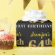 Este diseño de papel envolvente incluye un mensaje como "¡El CUMPLEAÑOS 64 de Jennifer!", y el "64" tiene un aspecto de color falso/imitación dorado. El nombre se puede personalizar y el fondo es negro de color. Tal vez podría usarse cuando se envuelven regalos para el 64 cumpleaños de alguien. [~Z0000177]