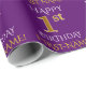 Papel De Regalo Oro púrpura, falso "FELIZ PRIMER CUMPLEAÑOS"