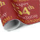 Este diseño de papel envolvente incluye un mensaje como "FELIZ 54º CUMPLEAÑOS", con el "54º" con una apariencia de imitación de oro. También incluye un nombre que se puede personalizar y un fondo de color rojo. Tal vez podría ser usado cuando se envuelven regalos para el cincuenta y cuarto cumpleaños de alguien. [~Z0000131]