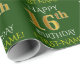 Este diseño de papel envolvente presenta un mensaje como "FELIZ CUMPLEAÑOS 16", con el "16" en apariencia de oro falso/imitación. También incluye un nombre que se puede personalizar y un fondo de color verde. Tal vez podría ser usado cuando se envuelven regalos para el cumpleaños dieciséis de alguien. [~Z0000132]