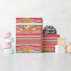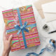 Oso de peluche marrón con rayas horizontales rojas y verdes. Se puede usar para regalo de bebé o cumpleaños.