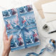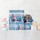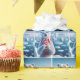 Un oso polar con una bufanda de rayas rojas y blancas se para en un paisaje helado formando un corazón con sus patas