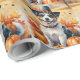Una pintura acuarela de un perro alegre sentado en medio de un montón de hojas caídas vibrantes, rodeado de pequeñas calabazas y bellotas dispersas. El perro lleva un pequeño gorra peregrino y vigas de alegría, capturando el espíritu del Día de Acción de Gracias. Como telón de fondo, los campos de suave cosecha y los árboles de tonos dorados crean un ambiente campestre tranquilo. Las texturas suaves y los tonos cálidos y mudos del otoño le dan al lugar un ambiente acogedor y nostálgico, perfecto para celebrar la belleza de la temporada.