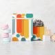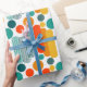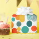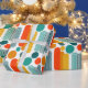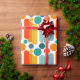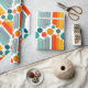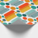 Este papel envolvente tiene un diseño moderno de mediados de siglo de ovarios y círculos en naranja, oro, verde azulado y turquesa sobre un campo de blanco. ¿Quieres el mismo diseño con colores diferentes? Mándame un mensaje.